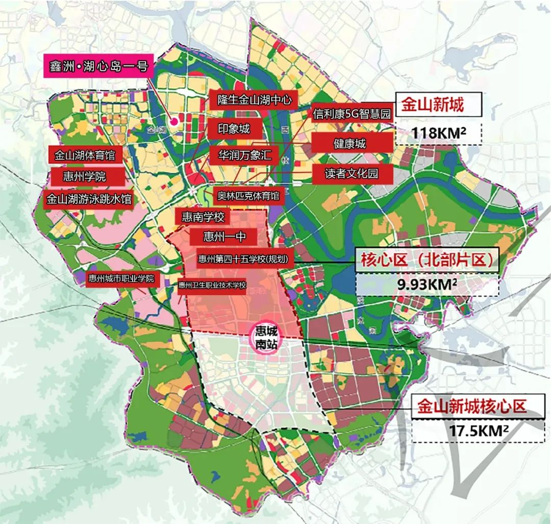 2017年,惠州市自然資源局發出《惠州市金山湖片區控制性詳細規劃 (調整)(草案)》,確定了金山湖區域“一廊四心六組團”的空間結構。其中,“四心“指的是金山湖為惠州未來的商業中心、新城市中心、養老服務中心、體育中心。
